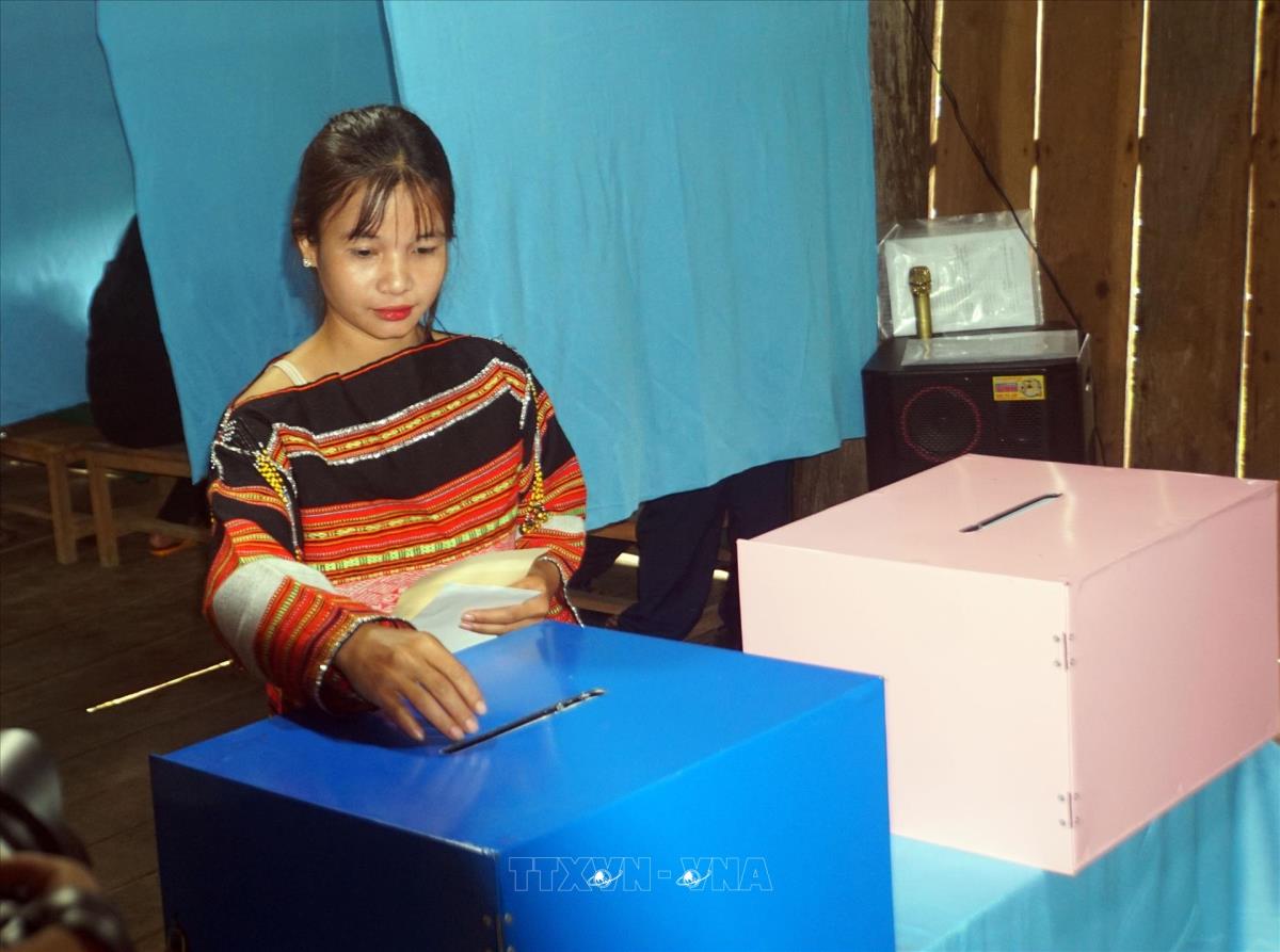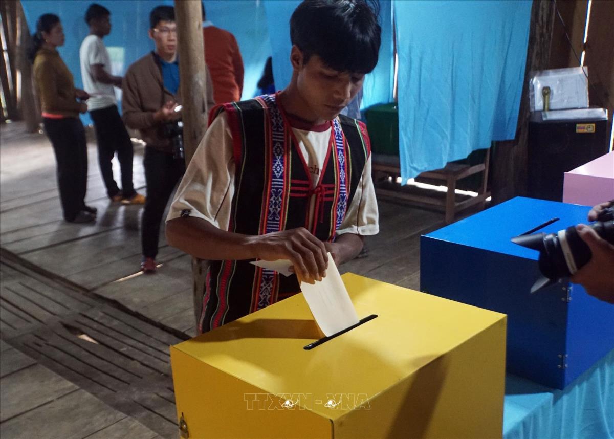 Gia Lai (TTXVN 14/3/2026) Vì địa hình xa xôi cách trở, đời sống kinh tế đặc biệt khó khăn, nên sáng ngày 14/3, bà con cử tri làng O2, xã Vĩnh Sơn, tỉnh Gia Lai đã hoàn tất cuộc bầu cử đại biểu Quốc hội khóa XVI và đại biểu Hội đồng nhân dân các cấp nhiệm kỳ 2026 - 2031 trước 1 ngày so với cả nước. Cử tri làng O2 đang bỏ phiếu bầu cử.