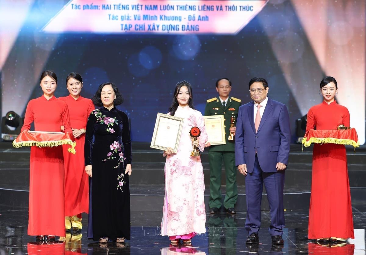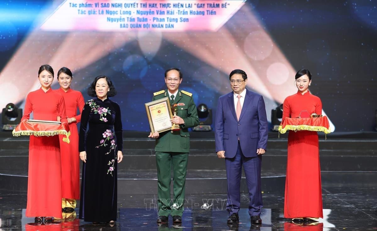 Thủ tướng chính phủ Phạm Minh Chính và Ủy viên Bộ Chính trị, Thường trực Ban Bí thư, Trưởng Ban Tổ chức Trung ương Trương Thị Mai trao giải A cho các tác giả, nhóm tác giả có tác phẩm đoạt giải. Ảnh: Minh Quyết - TTXVN
