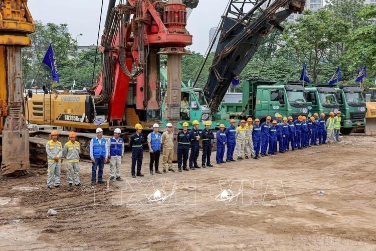 Các kỹ sư, công nhân xây dựng tại Lễ khởi công Dự án đầu tư xây dựng nút giao khác mức giữa đường Vành đai 3,5 với Đại lộ Thăng Long và thông xe tuyến đường Lê Quang Đạo kéo dài nối quận Nam Từ Liêm với quận Hà Đông (Hà Nội, 19/4/2025). Ảnh: Trung Nguyên - TTXVN
