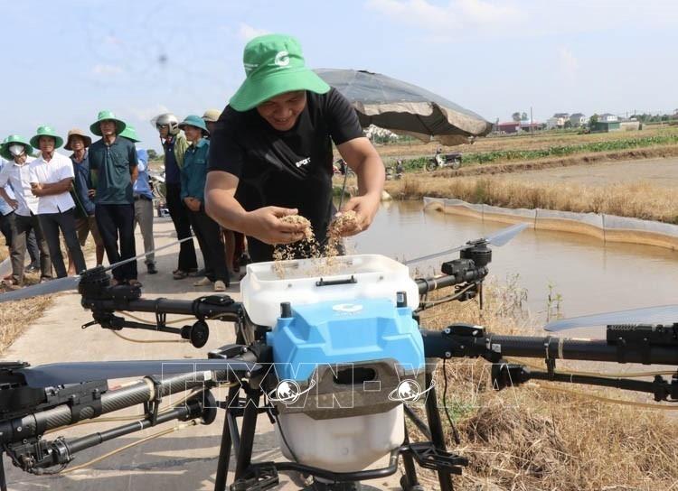 Hướng dẫn nông dân Bắc Ninh chuẩn bị gieo giống lúa bằng thiết bị bay không người lái. Ảnh: Đỗ Huyền - TTXVN