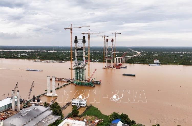 Công nhân trên công trường cầu Rạch Miễu 2 thi công xuyên Lễ Quốc khánh 2/9 để đảm bảo tiến độ xây dựng công trình, phấn đấu vượt tiến độ, hoàn thành công trình vào dịp Quốc khánh 2/9/2025. Ảnh: Hồng Đạt - TTXVN