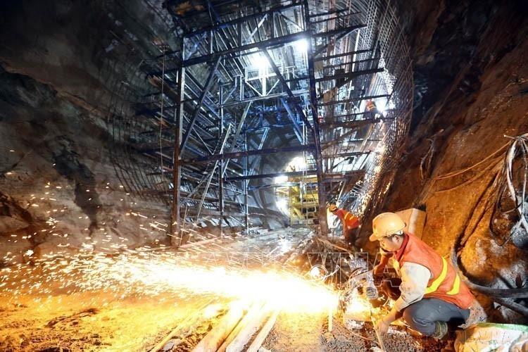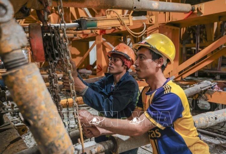 Công nhân tích cực lao động, đẩy nhanh tiến độ tại hầm số 3 - hầm dài nhất trên toàn tuyến thuộc cao tốc Quảng Ngãi - Hoài Nhơn . Ảnh: Hoàng Hiếu - TTXVN