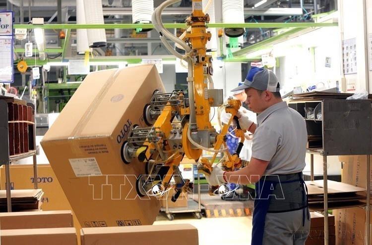 Dây chuyền đóng gói sản phẩm của Nhà máy TOTO Việt Nam (Khu công nghiệp Thăng Long 2, huyện Mỹ Hào, tỉnh Hưng Yên). Ảnh: Tuấn Anh - TTXVN