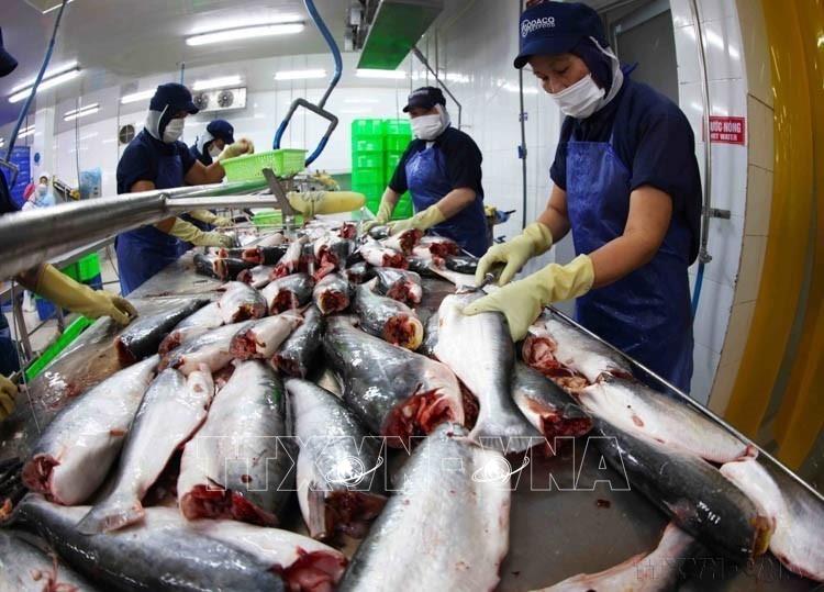 Công nhân chế biến cá tra nguyên con xuất khẩu ở nhà máy của Công ty CP Chế biến thuỷ sản Gò Đàng khu công nghiệp Mỹ Tho, thành phố Mỹ Tho, tỉnh Tiền Giang. Ảnh: Vũ Sinh – TTXVN
