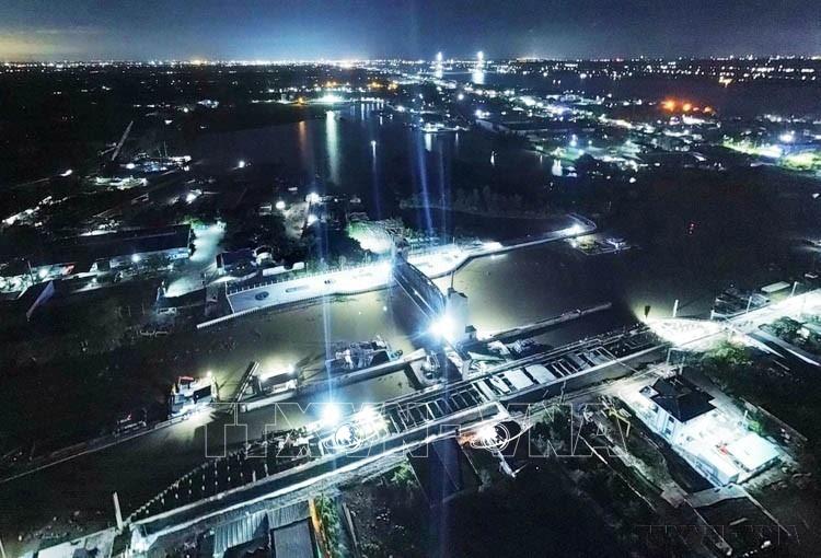 Công nhân trên công trình Cống ngăn mặn Nguyễn Tấn Thành ở huyện Châu Thành (Tiền Giang) làm việc xuyên đêm để đảm bảo tiến độ công trình. Ảnh: TTXVN phát