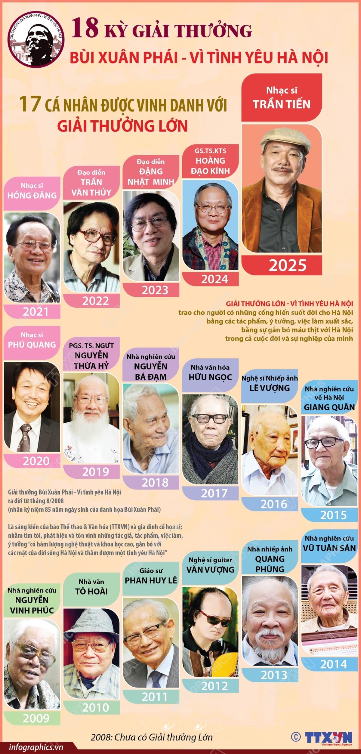 Tối 3/10/2025, Lễ trao giải Bùi Xuân Phái - Vì tình yêu Hà Nội lần thứ 18 năm 2025 đã diễn ra tại Trung tâm triển lãm 45 Tràng Tiền, Hà Nội. Trên cơ sở Danh sách gồm 11 đề cử chính thức, Giải thưởng Lớn - Vì tình yêu Hà Nội đã được trao cho nhạc sĩ Trần Tiến; bên cạnh đó là 4 giải đồng hạng cho các hạng mục: Giải Tác phẩm, Giải Ý tưởng, Giải Việc làm (riêng Giải Tác phẩm có 2 giải). Giải thưởng Bùi Xuân Phái - Vì tình yêu Hà Nội do báo Thể thao & Văn hóa, Thông tấn xã Việt Nam và Quỹ Bùi Xuân Phái tổ chức từ năm 2008. Qua 18 lần trao giải, đã có 17 cá nhân được trao Giải thưởng Lớn - Vì tình yêu Hà Nội.
