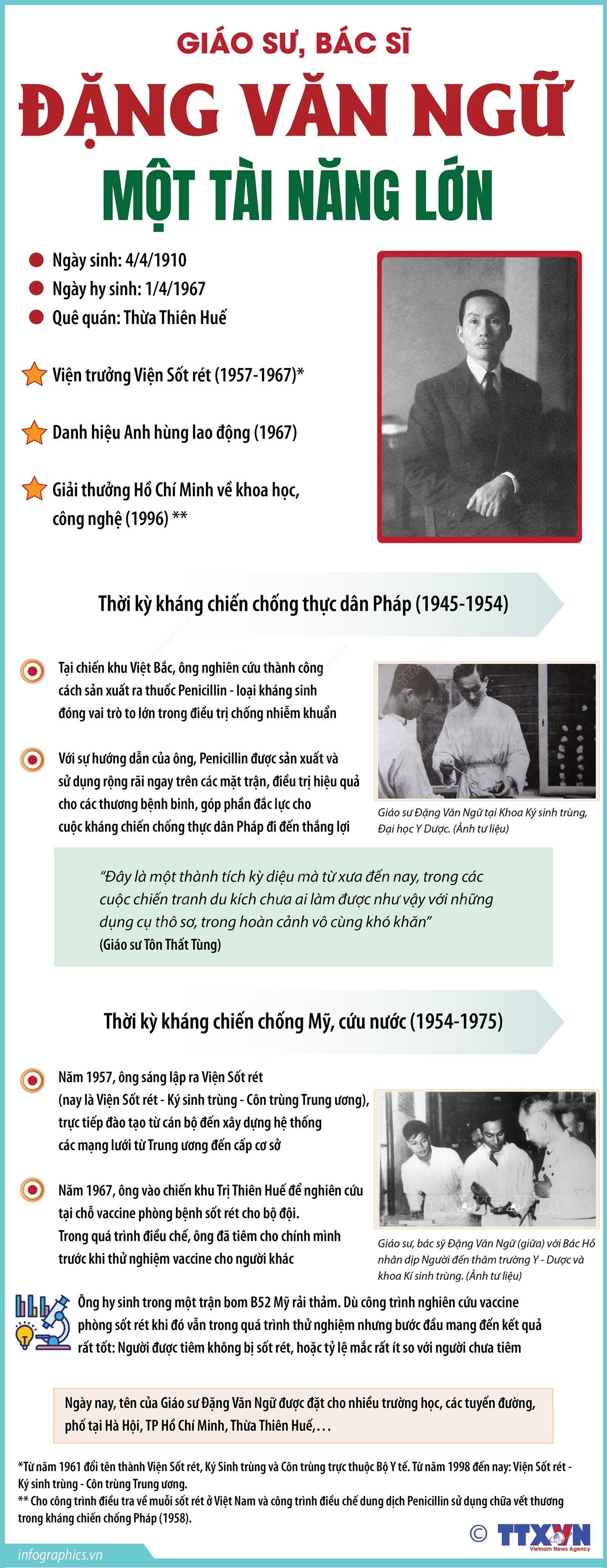 Ông cũng là người có công lớn trong việc nghiên cứu, điều chế vaccine phòng bệnh sốt rét, góp phần quan trọng đẩy lùi bệnh sốt rét, cứu sống hàng vạn bộ đội, thanh niên xung phong trong thời kỳ kháng chiến chống Mỹ, cứu nước của dân tộc. Giáo sư, Bác sĩ Đặng Văn Ngữ đã cống hiến cả cuộc đời cho khoa học và đất nước.
