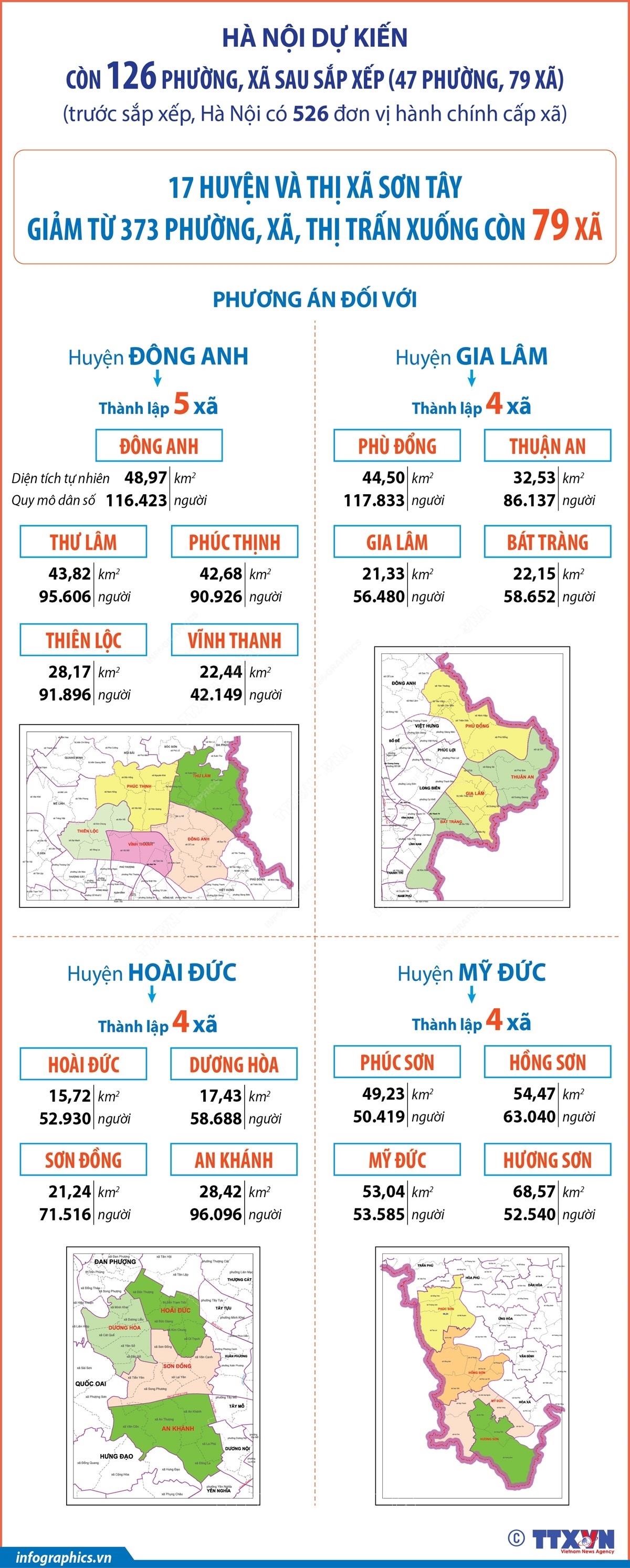 “Thành phố Hà Nội tổ chức lại 526 xã, phường, thị trấn thành 126 đơn vị hành chính cơ sở mới là đúng chủ trương, định hướng chỉ đạo của Trung ương và phù hợp với tình hình thực tiễn của Hà Nội”, văn bản nêu rõ. Theo phương án sắp xếp đơn vị hành chính cấp xã của thành phố, trong số 126 đơn vị hành chính cơ sở mới, có 47 đơn vị hành chính phường và 79 đơn vị hành chính xã.