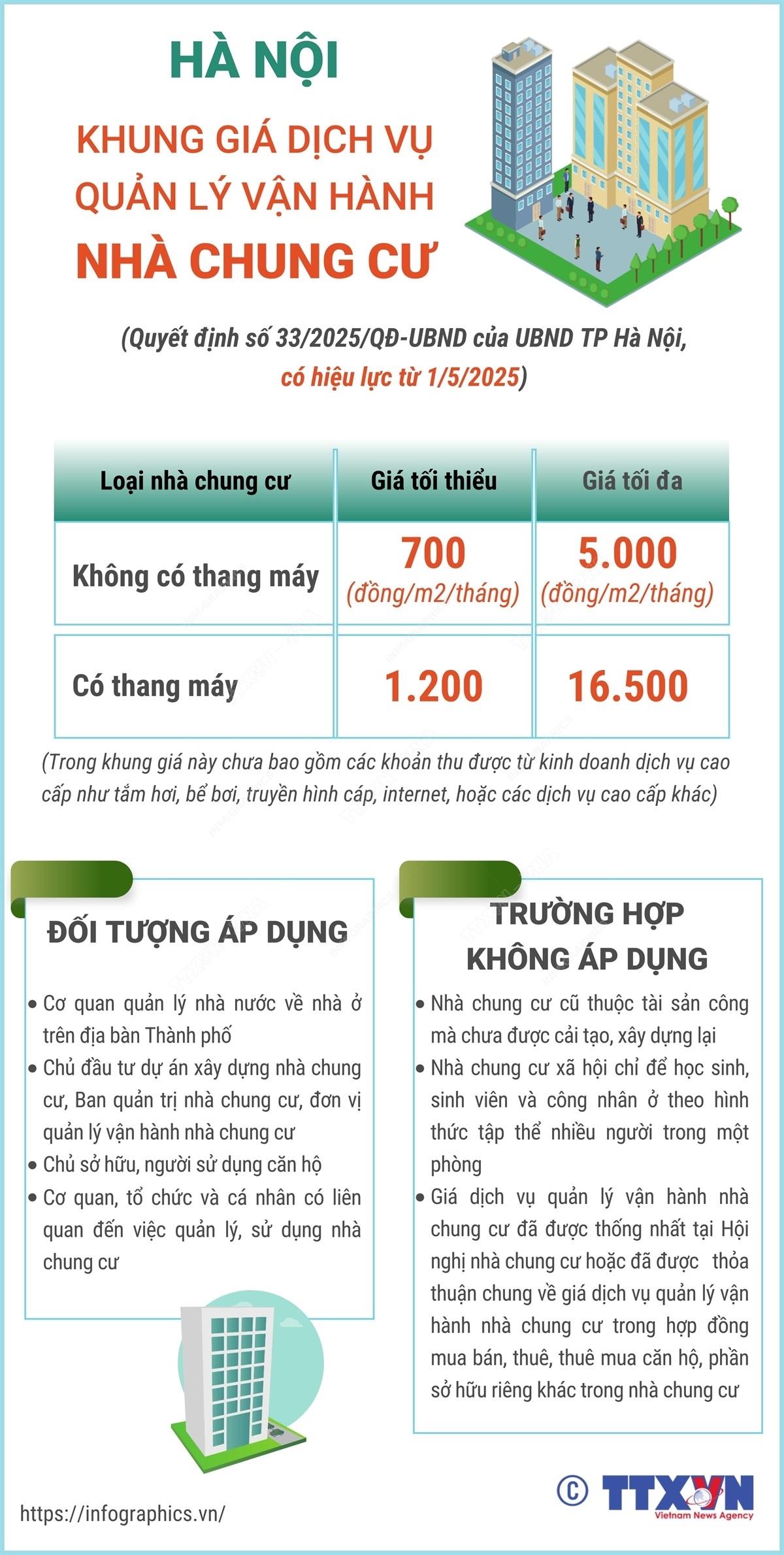 Hà Nội (TTXVN 2/5/2025) Theo Quyết định số 33/2025/QĐ-UBND của UBND TP Hà Nội, từ 1/5/2025, giá dịch vụ quản lý vận hành nhà chung cư tối thiểu 700 đồng và tối đa là 16.500 đồng/m2/tháng, tùy thuộc vào nhà chung cư có thang máy hay không có thang máy.