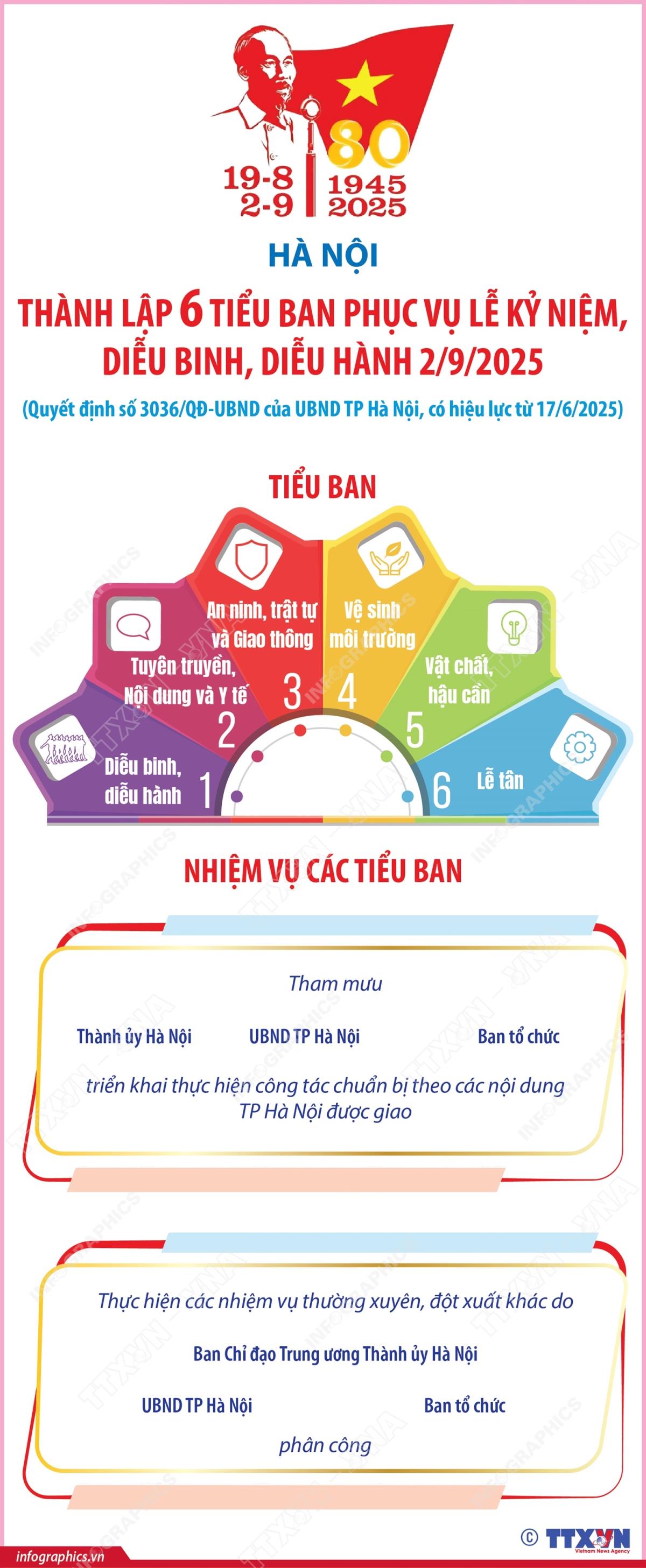 [Infographics] Hà Nội thành lập 6 tiểu ban phục vụ lễ kỷ niệm, diễu binh, diễu hành 2/9/2025
