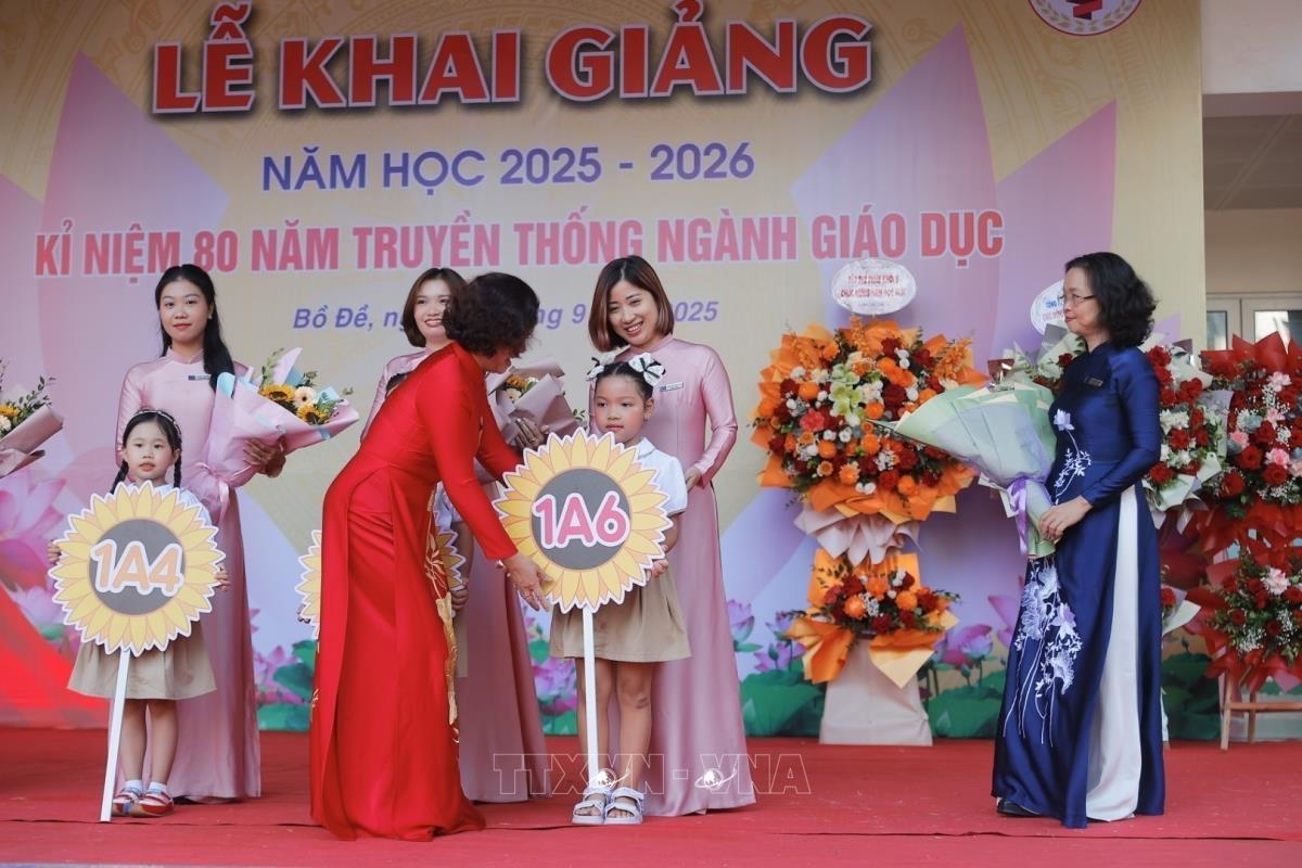 Sáng 5/9/2025, Nghi thức đón học sinh lớp 1 tại trường tiểu học Gia Quất (Bồ Đề). Ảnh: Minh Quyết - TTXVN