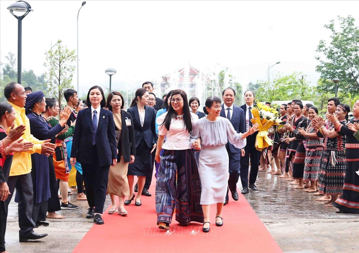 Hai Phu nhân múa xòe đoàn kết cùng đồng bào các dân tộc phía Bắc (28/4/2025). Ảnh: Minh Đức – TTXVN