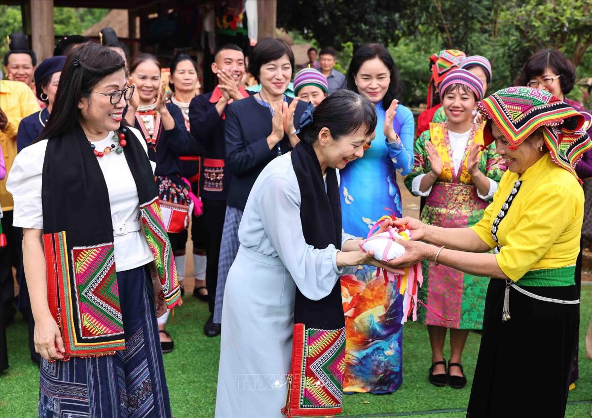 Nghệ nhân Lò Thị Tóm đại diện nhóm đồng bào Thái tặng bà Lê Thị Bích Trân, Phu nhân Thủ tướng Phạm Minh Chính và bà Ishiba Yoshiko, Phu nhân Thủ tướng Nhật Bản khăn Piêu và quả còn (28/4/2025). Ảnh: Minh Đức – TTXVN