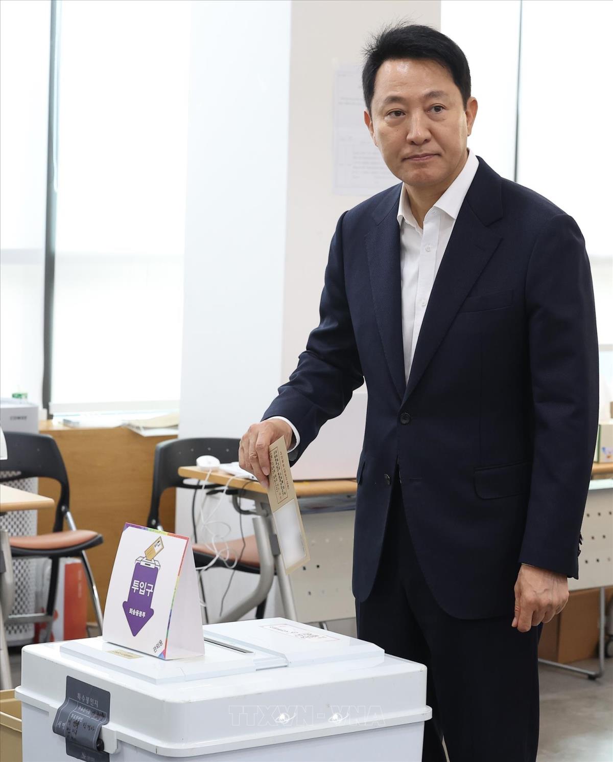 Thị trưởng Seoul Oh Se-hoon bỏ phiếu sớm bầu Tổng thống tại điểm bầu cử ở Seoul, Hàn Quốc, ngày 29/5/2025. Ảnh: Yonhap/TTXVN