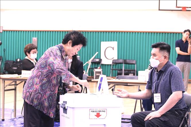 Cử tri bỏ phiếu tại điểm bầu cử ở trường tiểu học thuộc quận Yeongdeungpo, thủ đô Seoul. Ảnh: Khánh Vân/ PV TTXVN tại Seoul