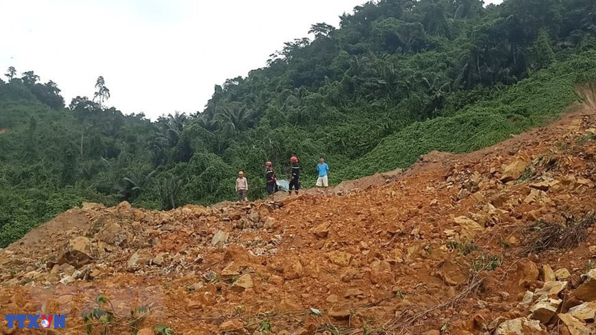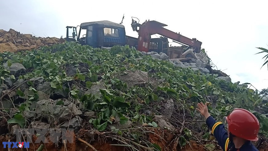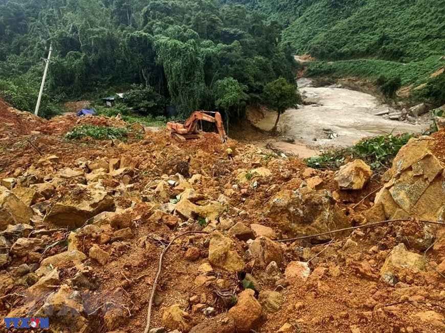 Đất đá vùi lấp tại khu vực thủy điện Rào Trăng 3.(Ảnh: TTXVN phát)