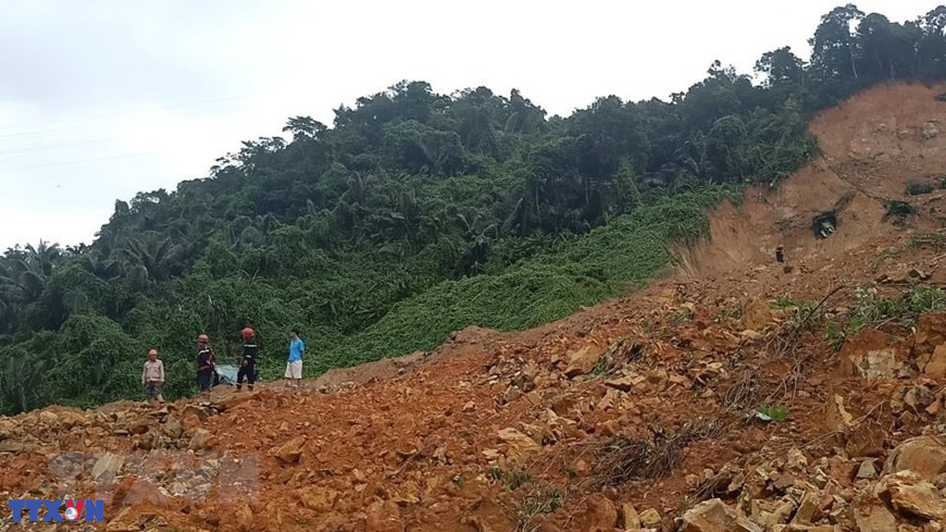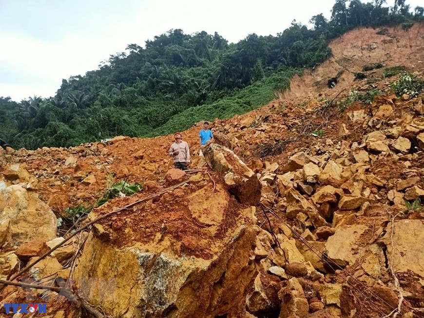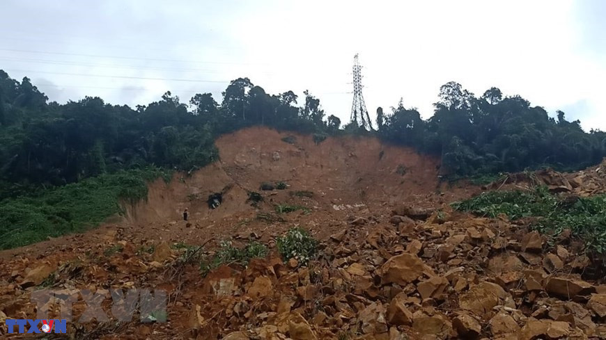 Cả nửa quả đồi sạt lở, vùi lấp tại khu vực nhà điều hành thủy điện Rào Trăng 3, xã Phong Xuân, huyện Phong Điền. (Ảnh: TTXVN phát)