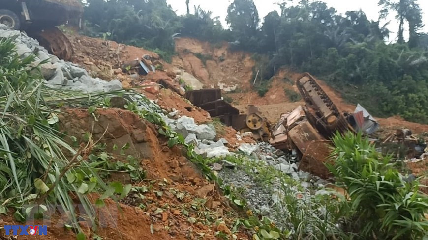 Khu vực thủy điện Rào Trăng 3 bị vùi lấp, nhiều xe, máy xúc nằm chỏng chơ. (Ảnh: TTXVN phát)