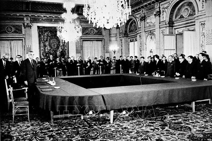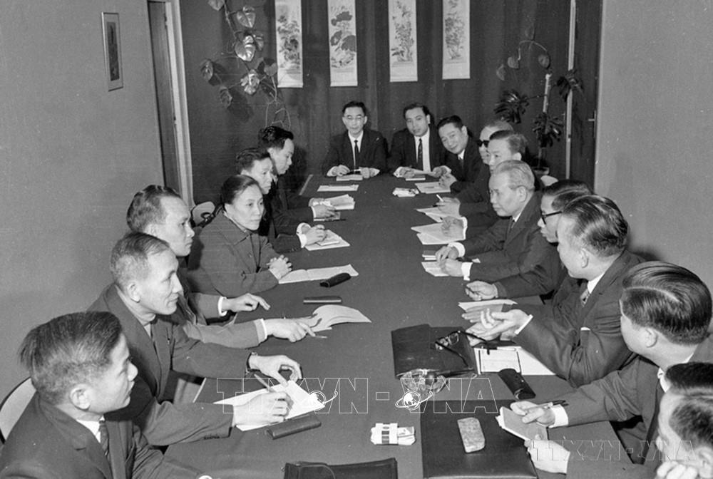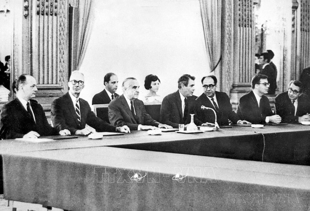 Ngày 25/1/1969, Hội nghị bốn bên về hòa bình tại Việt Nam chính thức khai mạc phiên toàn thể đầu tiên, gồm 4 đoàn đại biểu: Việt Nam Dân chủ Cộng hòa, Mặt trận Dân tộc Giải phóng miền Nam Việt Nam, Hoa Kỳ và Việt Nam Cộng hòa. Ảnh: Tư liệu TTXVN