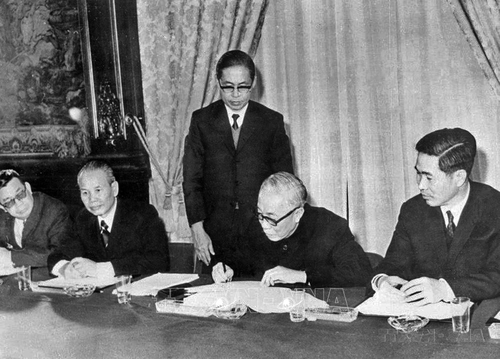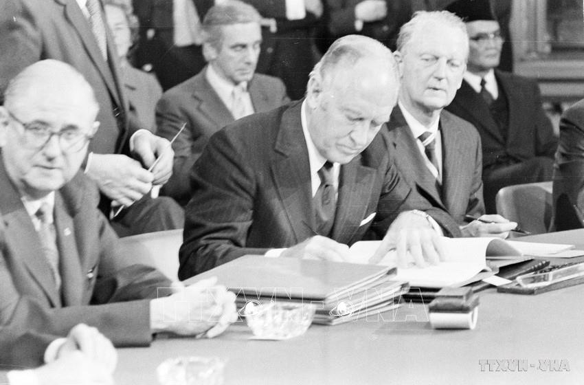 Hội nghị quốc tế về Việt Nam họp tại Paris từ ngày 26/2 - 2/3/1973, kết thúc bằng việc ký Định ước để bảo đảm hòa bình ở Việt Nam. Trong ảnh: Phó Thủ tướng, Bộ trưởng Ngoại giao Việt Nam Dân chủ Cộng hòa Nguyễn Duy Trinh (bên phải) ký Định ước của Hội nghị quốc tế về Việt Nam, ngày 2/3/1973. Ảnh: TTXVN phát