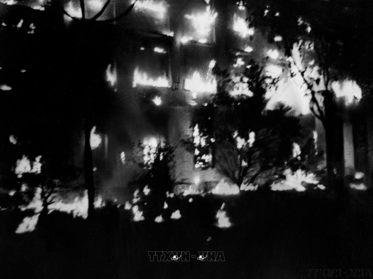 Thắng lợi của ký kết Hiệp định Paris là một trong những hệ quả của Chiến dịch Tổng tiến công Mậu Thân 1968. Trong ảnh: Các vị trí quan trọng của Mỹ tại Sài Gòn bị quân giải phóng tấn công Tết Mậu Thân (1968). Ảnh: Tư liệu TTXVN