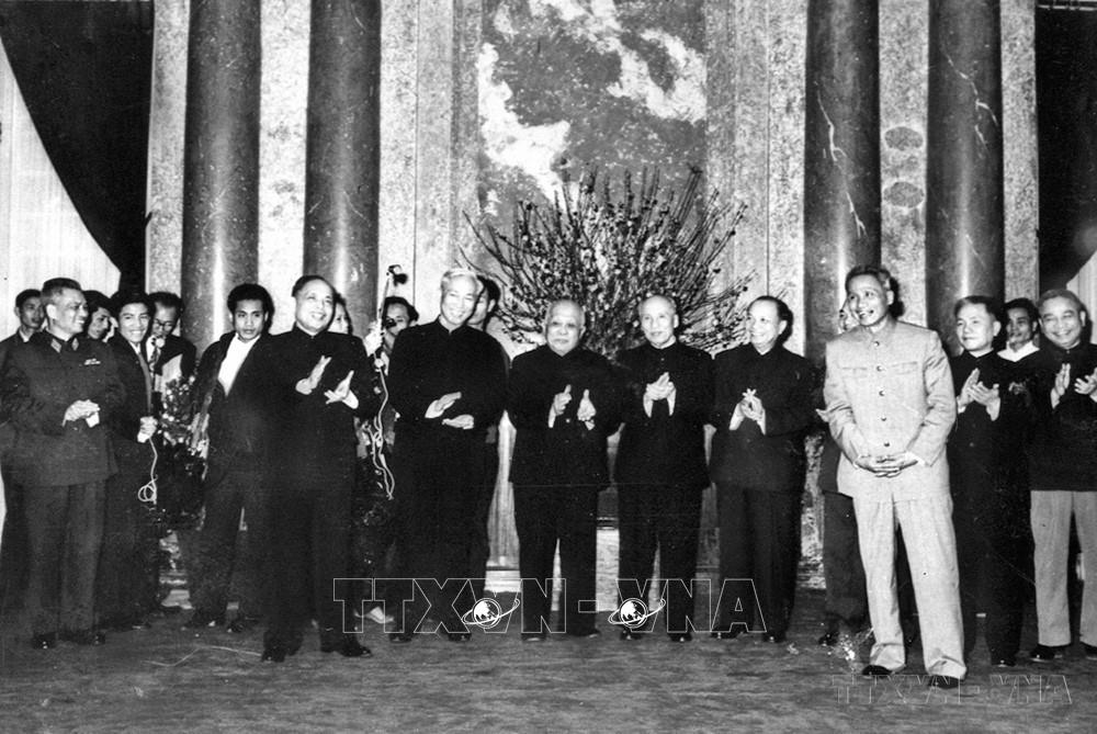 Lãnh đạo Đảng, Nhà nước đón Cố vấn đặc biệt Lê Đức Thọ và Phó Thủ tướng, Bộ trưởng Ngoại giao Nguyễn Duy Trinh ở Phủ Chủ tịch, sau khi ký Hiệp định Paris trở về. Đông đảo đại diện các đoàn ngoại giao đến chúc mừng, chia vui trước thắng lợi lịch sử của nhân dân ta. Ảnh: Tư liệu TTXVN