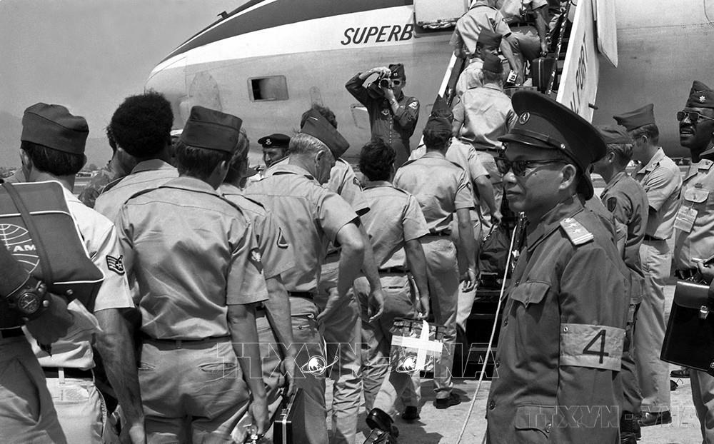 Thực thi Hiệp định Paris, trong 2 ngày 28 và 29/3/1973, tại sân bay Gia Lâm (Hà Nội), 107 nhân viên quân sự Mỹ được Chính phủ Việt Nam Dân chủ Cộng hòa trao trả (đợt cuối cùng) cho phía Mỹ. Ảnh: Văn Bảo - TTXVN