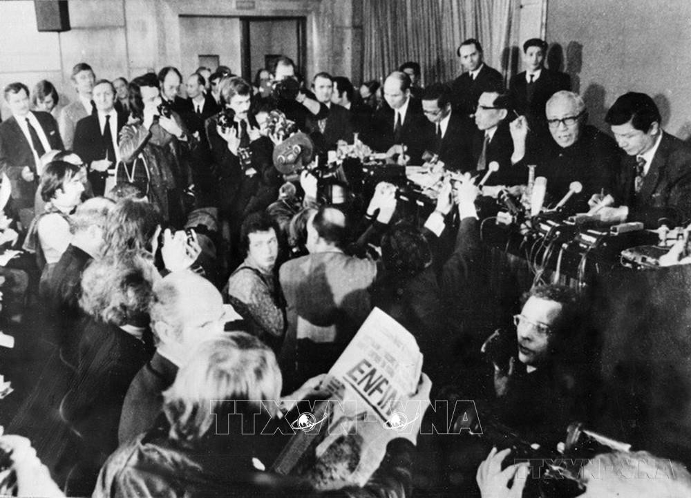 Cố vấn đặc biệt của Chính phủ Việt Nam Dân chủ Cộng hòa Lê Đức Thọ họp báo, giới thiệu nội dung Hiệp định Paris về chấm dứt chiến tranh, lập lại hòa bình ở Việt Nam vừa được ký tắt (Paris, 24/1/1973). Ảnh: TTXVN