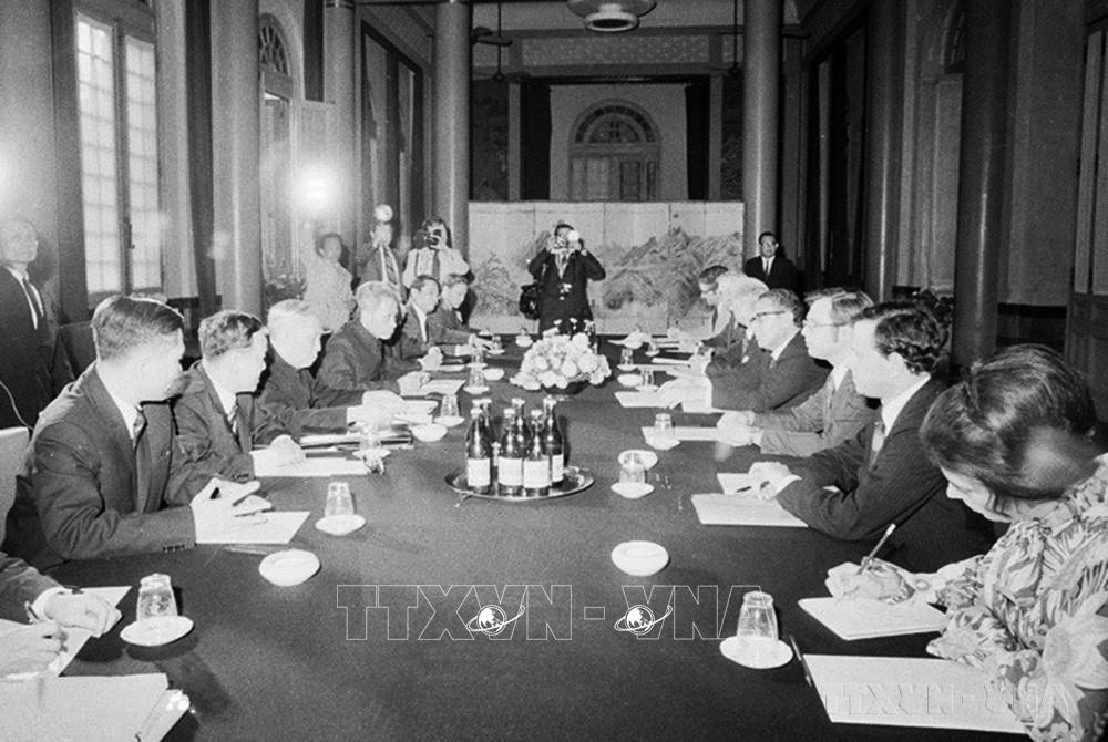 Ngày 13/5/1968, Hội nghị về hòa bình tại Việt Nam giữa hai bên: Việt Nam Dân chủ Cộng hòa và Hoa Kỳ khai mạc tại Paris. Do lập trường cương quyết của Việt Nam Dân chủ Cộng hòa, Hoa Kỳ buộc phải đối thoại chính thức với Mặt trận Dân tộc Giải phóng miền Nam Việt Nam và từ tháng 6/1969 là Chính phủ Cách mạng lâm thời Cộng hòa miền Nam Việt Nam. Trong ảnh: Đoàn đàm phán Hoa Kỳ do Đại sứ William Averell Harriman làm Trưởng đoàn, tại hội nghị. Ảnh: Tư liệu TTXVN