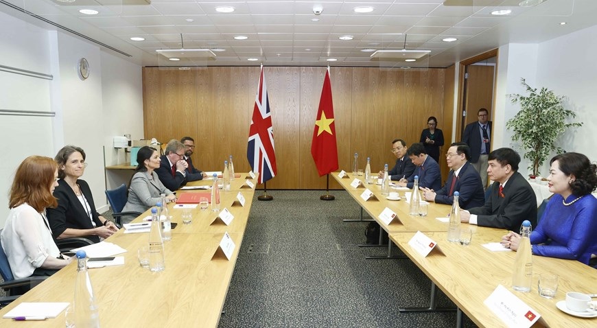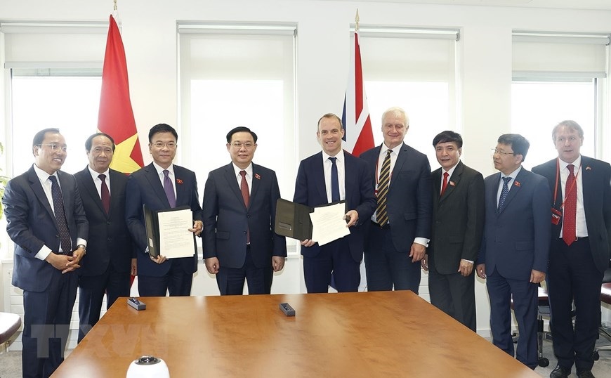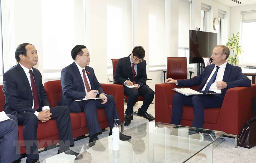 Chủ tịch Quốc hội Vương Đình Huệ làm việc với Phó Thủ tướng, Bộ trưởng Tư pháp Anh Dominic Raab. (Ảnh: Doãn Tấn/TTXVN)