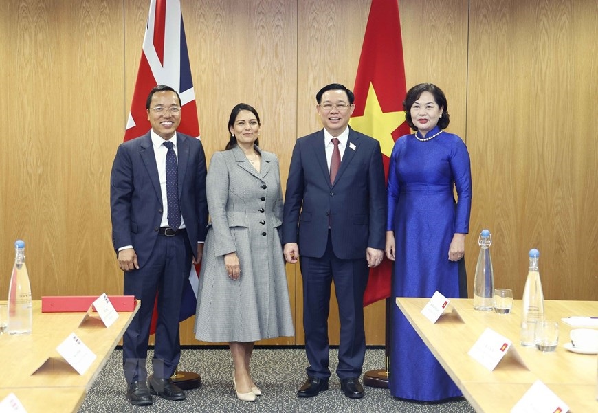 Chủ tịch Quốc hội Vương Đình Huệ và Bộ trưởng Nội vụ Anh Priti Patel. (Ảnh: Doãn Tấn/TTXVN)