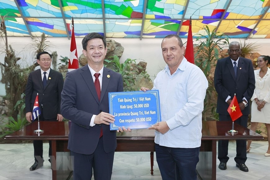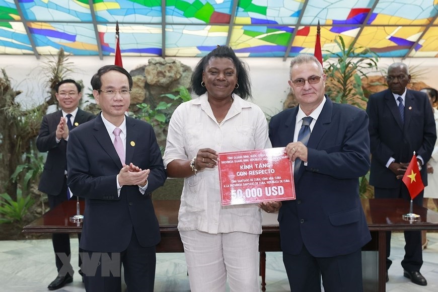Chủ tịch Quốc hội Vương Đình Huệ và Chủ tịch Quốc hội Cuba chứng kiến lãnh đạo tỉnh Quảng Trị trao số tiền 50.000 USD tặng thành phố Santiago de Cuba cùng thỏa thuận hợp tác giữa hai địa phương. (Ảnh: Doãn Tấn/TTXVN)