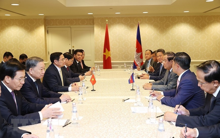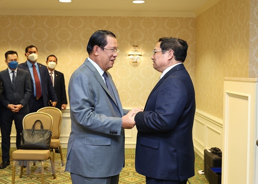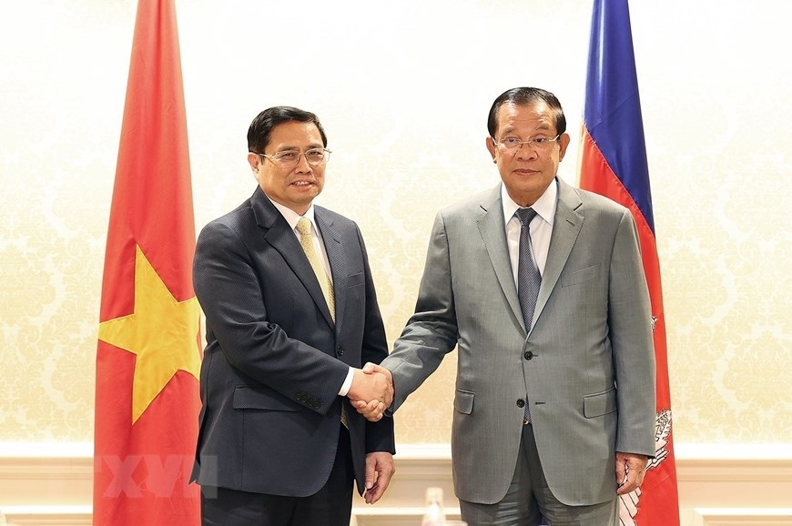 Thủ tướng Phạm Minh Chính gặp Thủ tướng Campuchia Hun Sen. (Ảnh: Dương Giang/TTXVN)