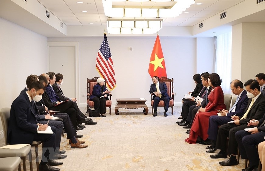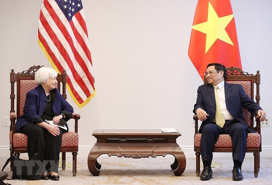 Thủ tướng Phạm Minh Chính tiếp bà Janet Yellen, Bộ trưởng Tài chính Hoa Kỳ. (Ảnh: Dương Giang/TTXVN)
