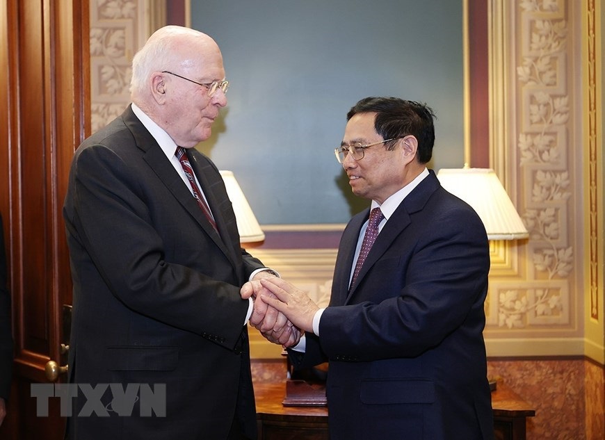 Thủ tướng Phạm Minh Chính gặp Thượng Nghị sỹ Patrick Leahy và một số nghị sỹ Hoa Kỳ. (Ảnh: Dương Giang/TTXVN)
