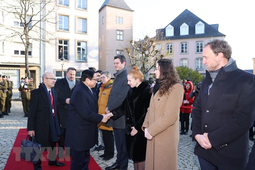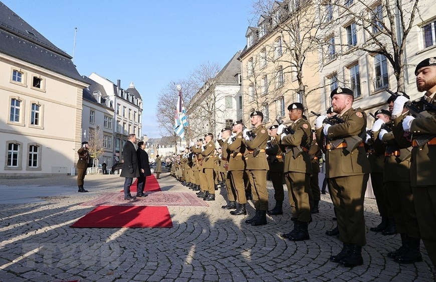 Quang cảnh Lễ đón Thủ tướng Phạm Minh Chính thăm chính thức Luxembourg. (Ảnh: Dương Giang/TTXVN)