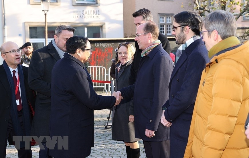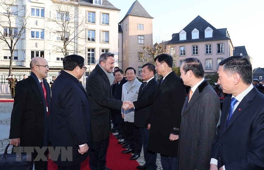 Thủ tướng Luxembourg Xavier Bettel đón Thủ tướng Phạm Minh Chính. (Ảnh: Dương Giang/TTXVN)