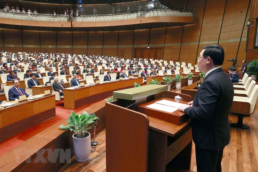 Hình ảnh Chủ tịch Quốc hội Vương Đình Huệ phát biểu bế mạc kỳ họp. (Ảnh: Doãn Tấn/TTXVN)