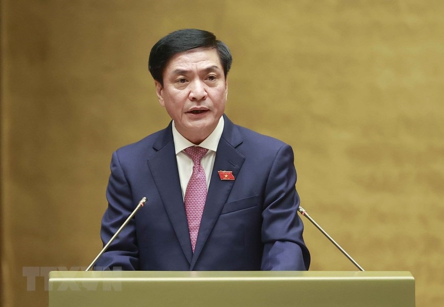 Ủy viên Ủy ban Thường vụ Quốc hội, Tổng Thư ký Quốc hội - Chủ nhiệm Văn phòng Quốc hội Bùi Văn Cường trình bày Báo cáo giải trình, tiếp thu, chỉnh lý dự thảo Nghị quyết kỳ họp thứ 5, Quốc hội khóa XV và dự thảo Nghị quyết kỳ họp thứ 5. (Ảnh: Doãn Tấn/TTXVN)
