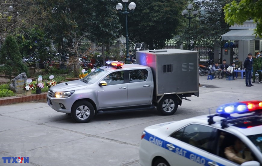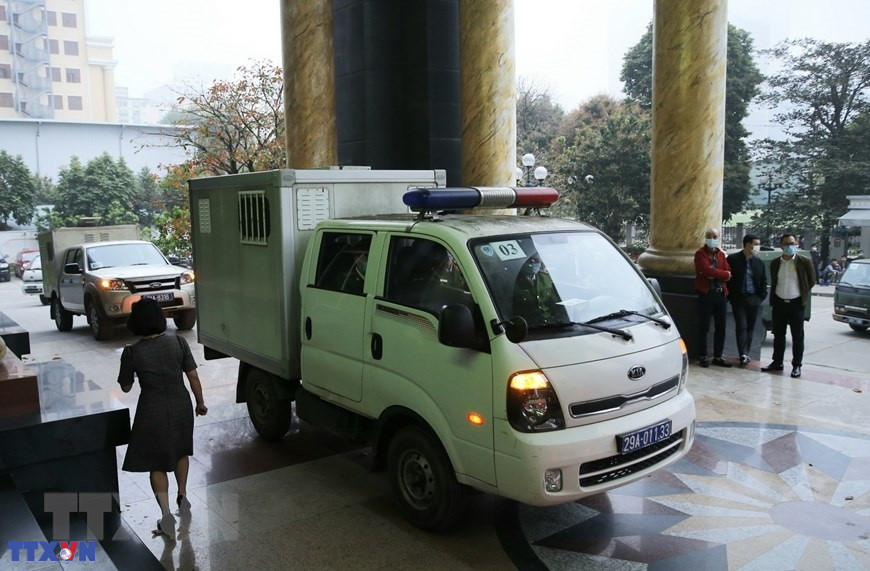 Cảnh sát dẫn giải các bị cáo tới tòa xét xử. (Ảnh: Doãn Tấn/TTXVN)