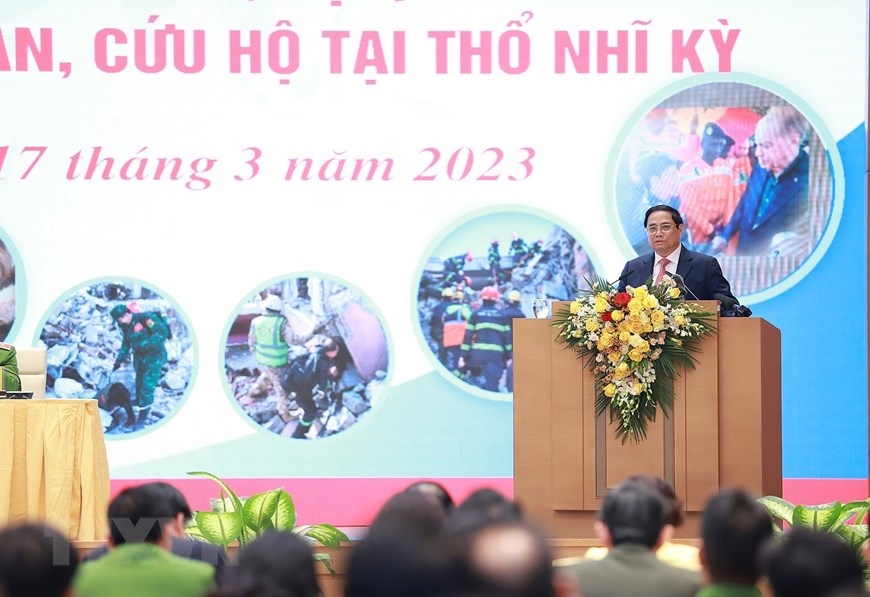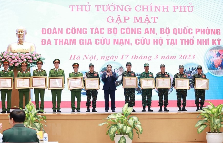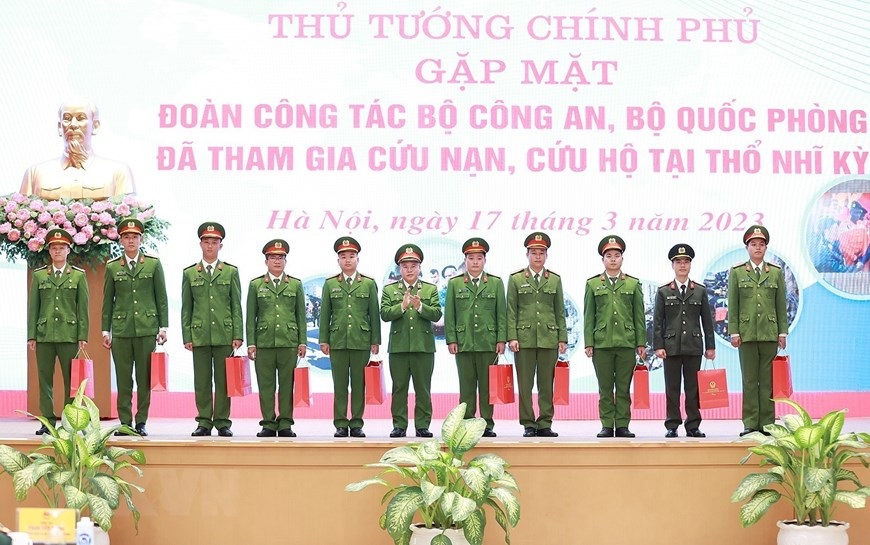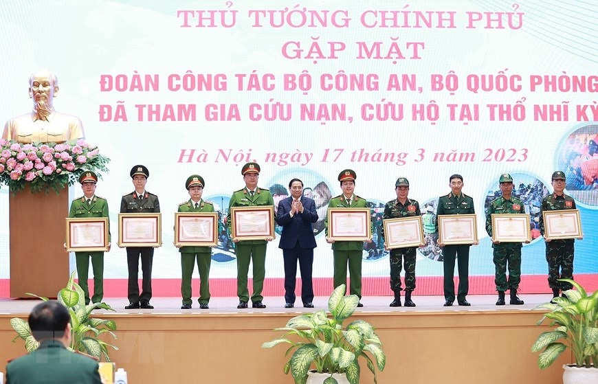 Hà Nội (TTXVN 17/3/2023) Chiều 17/3/2023, tại Hà Nội, Thủ tướng Phạm Minh Chính gặp mặt, tuyên dương đoàn cứu hộ, cứu nạn của Bộ Quốc phòng và Bộ Công an tham gia hoạt động hỗ trợ nhân đạo, cứu trợ thảm họa động đất ở Thổ Nhĩ Kỳ.