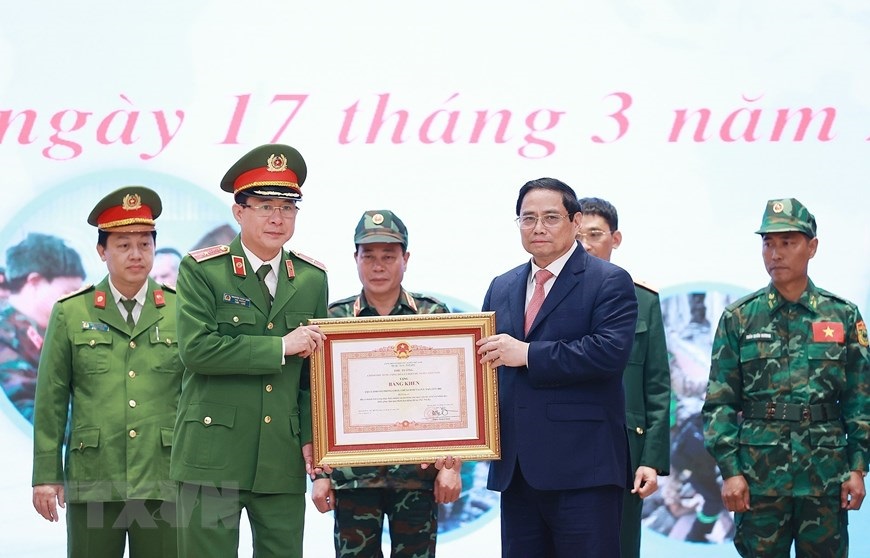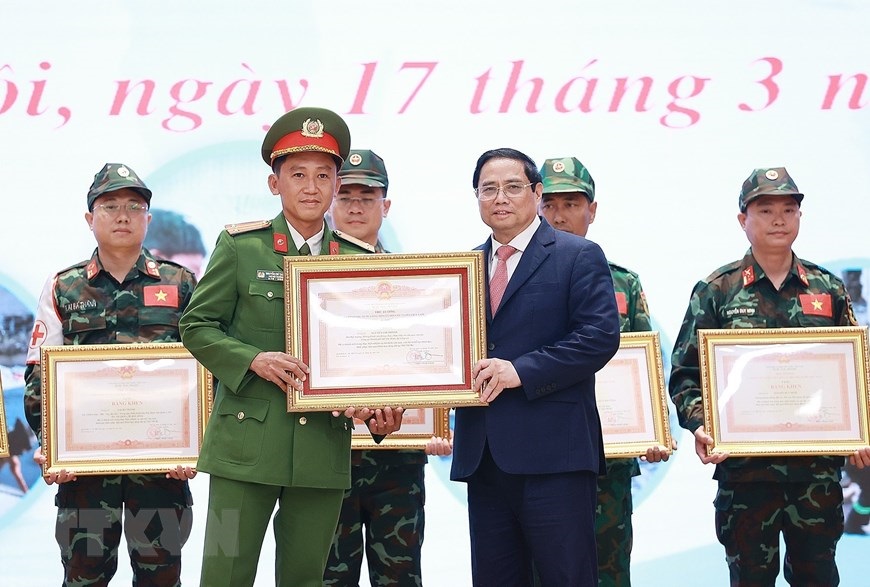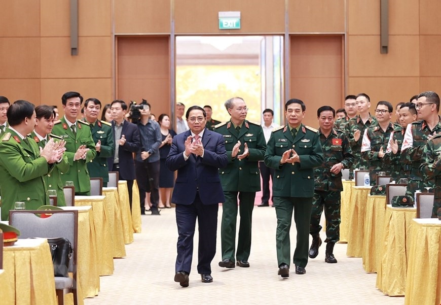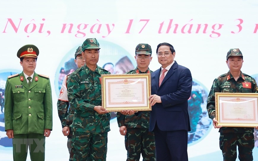 Chiều 17/3, tại Hà Nội, Thủ tướng Phạm Minh Chính gặp mặt, tuyên dương đoàn cứu hộ, cứu nạn của Bộ Quốc phòng và Bộ Công an tham gia hoạt động hỗ trợ nhân đạo, cứu trợ thảm họa động đất ở Thổ Nhĩ Kỳ. (Ảnh: Dương Giang/TTXVN)