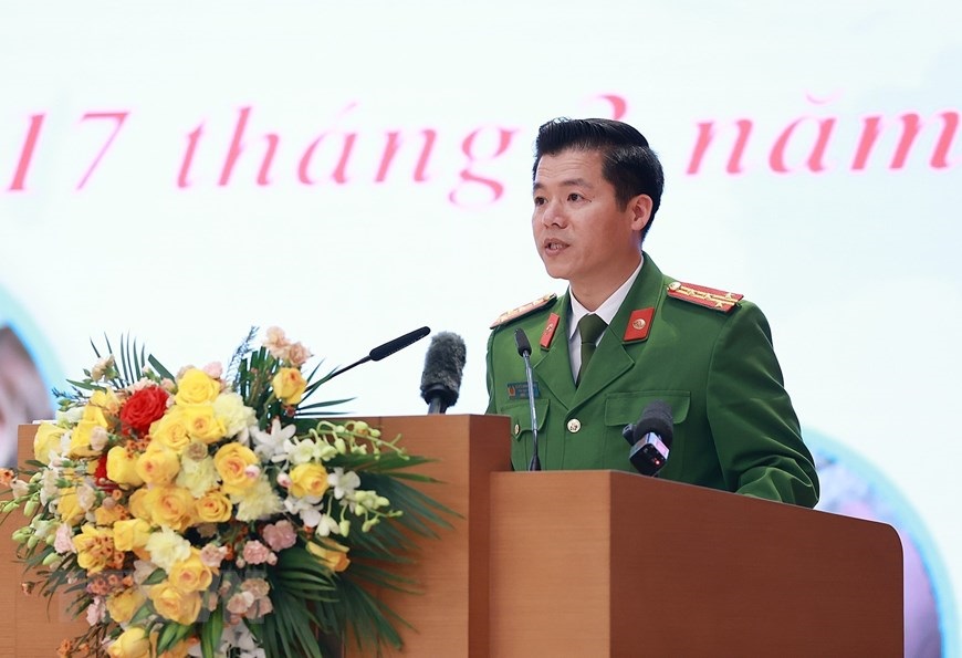 Đại tá Nguyễn Minh Khương, Trưởng đoàn công tác của Bộ Công an tham gia cứu nạn, cứu hộ tại Thổ Nhĩ Kỳ báo cáo quá trình thực hiện nhiệm vụ. (Ảnh: Dương Giang/TTXVN)