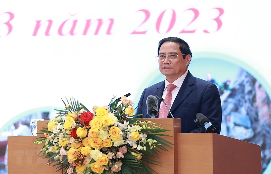 Thủ tướng Phạm Minh Chính phát biểu tuyên dương các lực lượng tham gia cứu nạn, cứu hộ làm nhiệm vụ tại Thổ Nhĩ Kỳ. (Ảnh: Dương Giang/TTXVN)