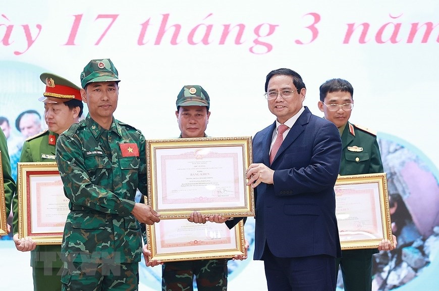 Thủ tướng Phạm Minh Chính trao Bằng khen tặng các cá nhân hoàn thành xuất sắc nhiệm vụ cứu hộ, cứu nạn tham gia khắc phục hậu quả thảm hoạ động đất tại Thổ Nhĩ Kỳ. (Ảnh: Dương Giang/TTXVN)