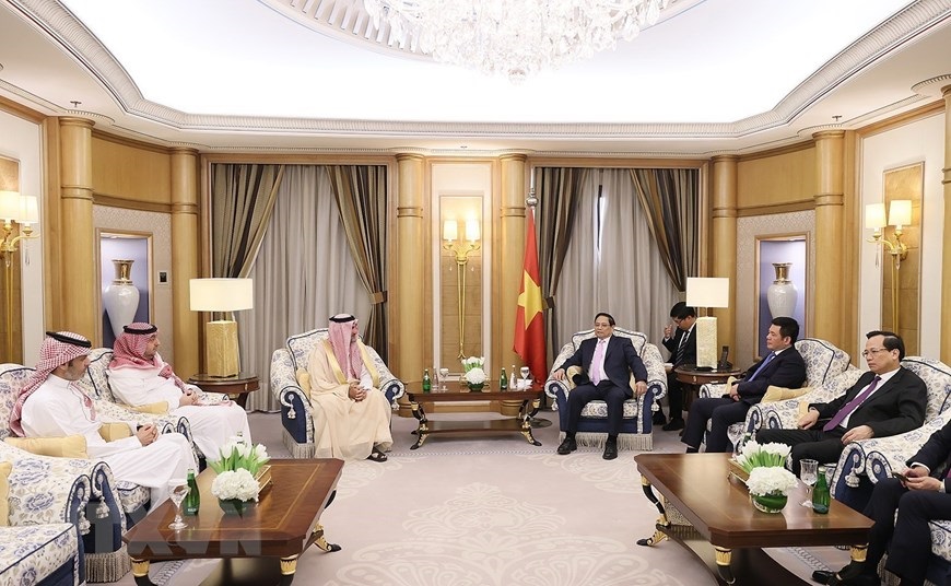 Thủ tướng Phạm Minh Chính tiếp ông Faisal Al-Ibrahim, Bộ trưởng Bộ Kinh tế-Kế hoạch Saudi Arabia. (Ảnh: Dương Giang/TTXVN)