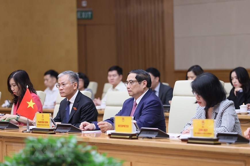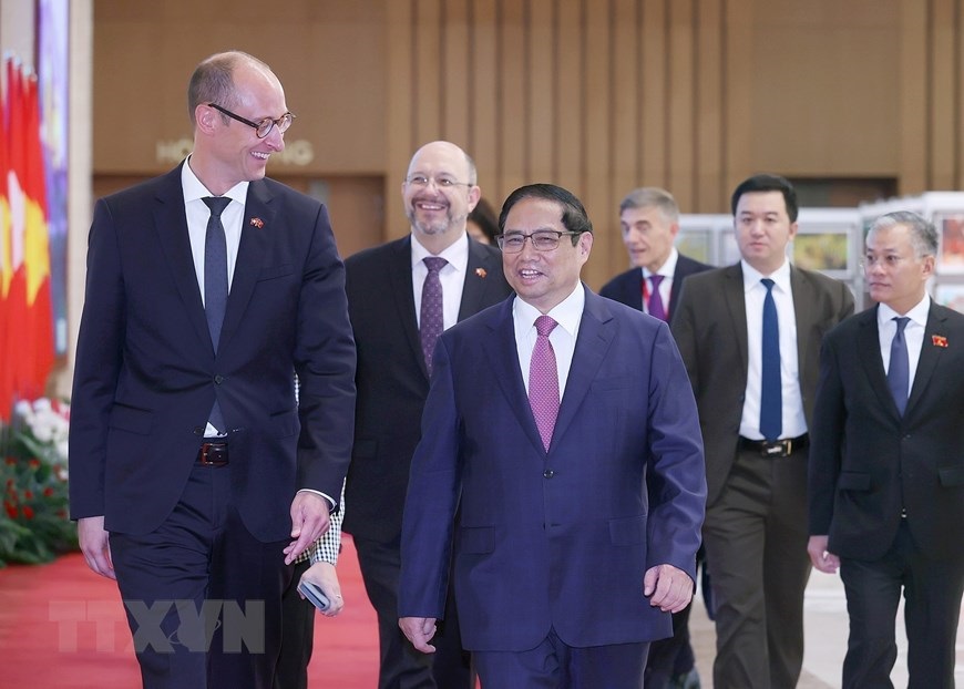 Thủ tướng Phạm Minh Chính tiếp Chủ tịch Hạ viện Thụy Sĩ Martin Candinas. (Ảnh: Dương Giang/TTXVN)