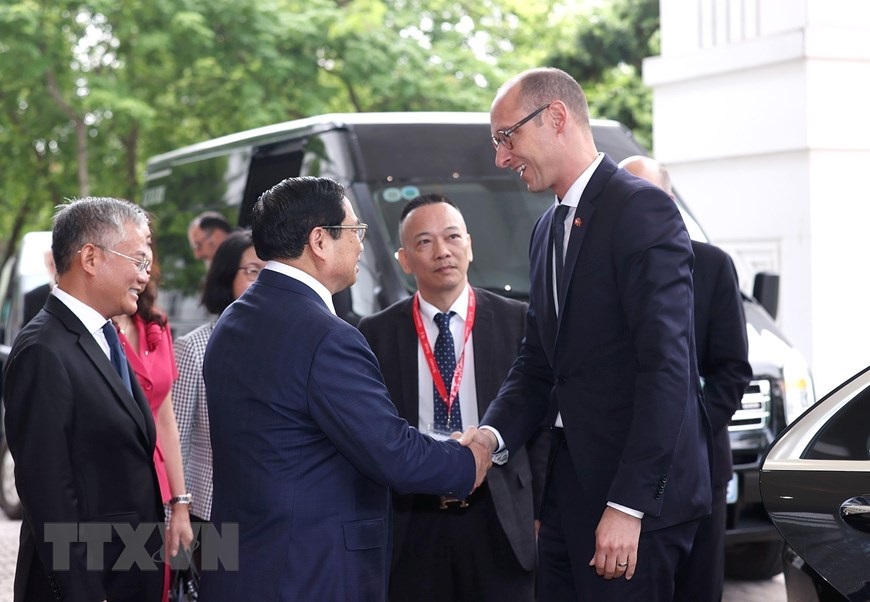 Chiều 30/6/2023, tại Hà Nội, Thủ tướng Phạm Minh Chính tiếp Chủ tịch Hội đồng Quốc gia Liên bang Thụy Sĩ (Chủ tịch Hạ viện) Martin Candinas đang thăm chính thức Việt Nam. (Ảnh: Dương Giang/TTXVN)