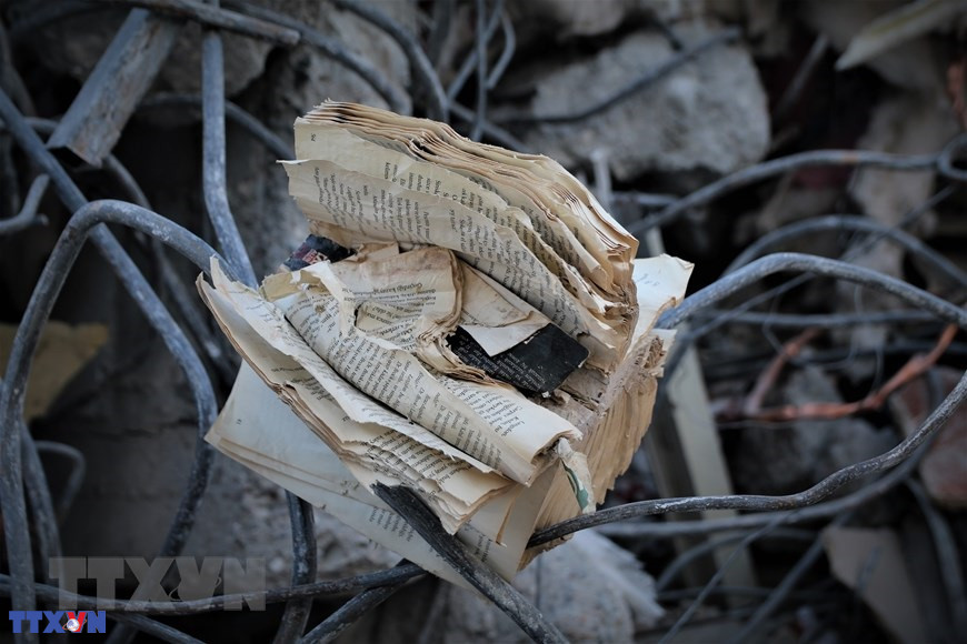Những dấu vết về sự tàn khốc của trận động đất còn vương lại khắp hiện trường đổ nát. (Ảnh: Trường Dụy/TTXVN)