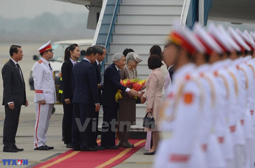 Đúng 15 giờ 10 chiều 28/2, chuyên cơ chở Nhà Vua và Hoàng hậu Nhật Bản hạ cánh xuống sân bay Nội Bài, bắt đầu chuyến thăm chính thức Việt Nam. (Ảnh: PV/Vietnam+)